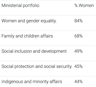 Genderstereotypen spelen niet enkel mee in ons beeld over de ideale politicus en hoe we naar vrouwen in de politiek kijken, maar bepalen mee welke politieke mandaten ze bekleden. Zo zien we wereldwijd dat vrouwen vaak een politiek mandaat bekleden gerelateerd aan mensenrechten, gendergelijkheid en sociale zaken, zoals afbeelding rechts toont.