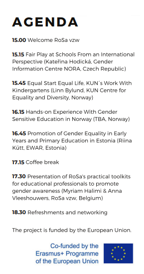 Het Erasmus+ project Fair Play at Schools wil het genderbewustzijn in het onderwijs versterken om gelijke kansen te bevorderen en ongelijkheid tegen te gaan. Dat beoogt het project in eerste instantie te verwezenlijken door leer- en leefomgevingen op school inclusiever te maken en leerkrachten niet alleen inzicht maar ook hands-on tips, tricks en methodieken aan te bieden om genderbewust aan de slag te gaan. Zo zijn alle kinderen vrij om nieuwe talenten te ontdekken en nieuwe vaardigheden te ontwikkelen in een veilige en aanmoedigende omgeving, zonder de druk van beperkende genderstereotypen. Gedurende drie jaar werkten drie van onze Europese partnerorganisaties samen rond deze doelstellingen: KUN Centre for Equality and Diversity (Noorwegen), Estonian Women's Associations Roundtable (Estland) en Gender Information Centre NORA (Tsjechië). RoSa is verheugd om hen op donderdag 25 augustus te mogen ontvangen in haar bibliotheek in hartje Brussel, of ook wel, hartje Europa. Deze inspiratiedag brengt tal van actoren uit het Europese onderwijslandschap tesamen en vormt dan ook de ideale gelijkheden om te netwerken, nieuwe partners te leren kennen en good practices uit te wisselen.