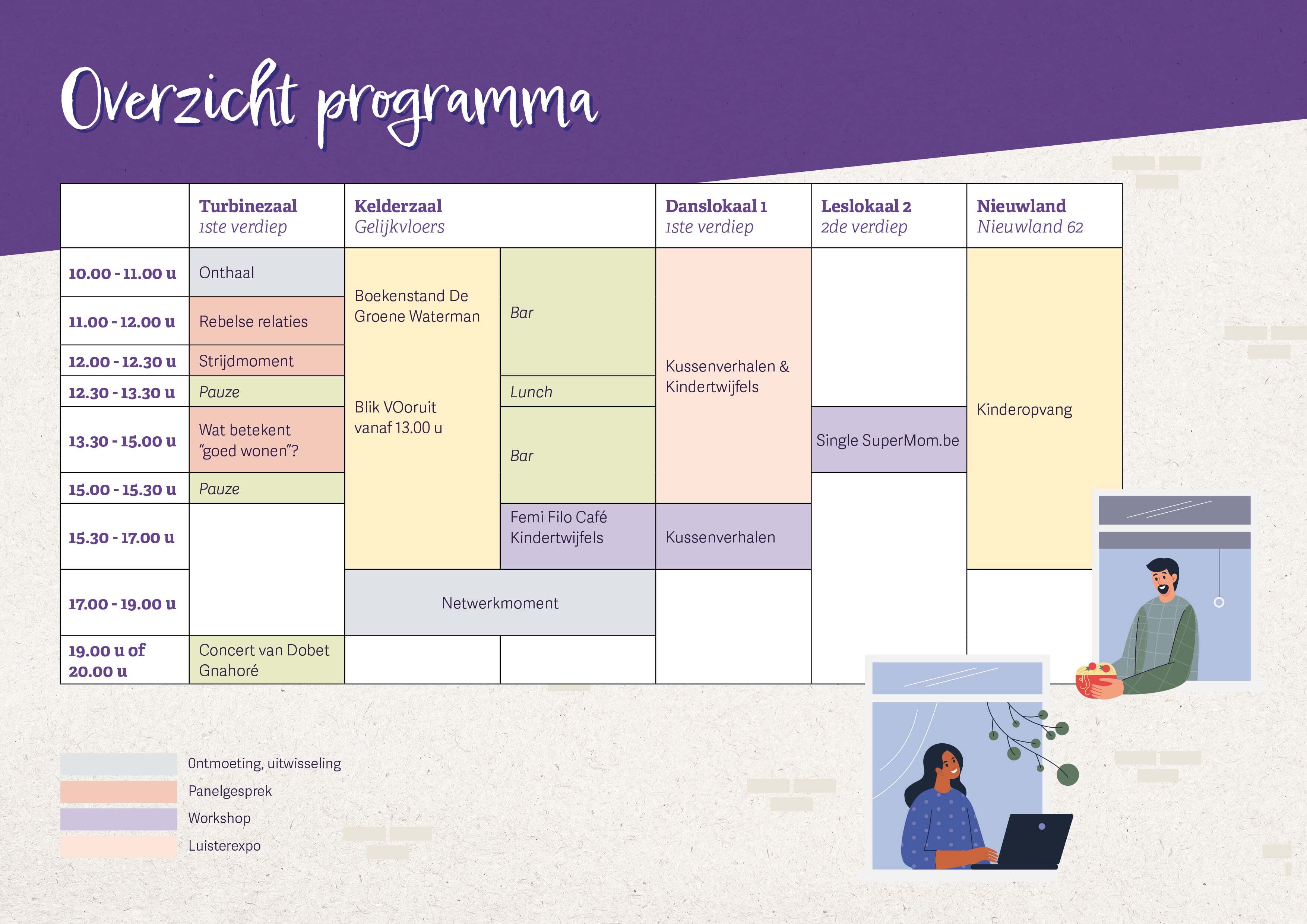 Van 13u30 tot 15u kan je ofwel een workshop volgen voor alleen ouderschap, georganiseerd door Furia en Labo vzw, ofwel aansluiten bij het panelgesprek over ‘goed wonen’. Sprekers zijn niemand minder dan Soumaya Majdoub (Women in Urbanism), Maggi Poppe (Vrouwenraad) en Joy Verstichele (Vlaams Huurdersplatform).