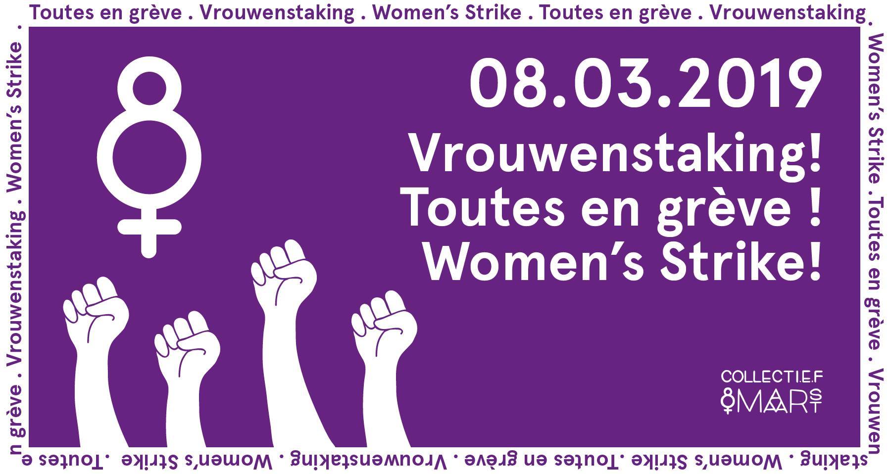 De eerste officiële algemene Belgische vrouwenstaking is een feit. Op vrijdag 8 maart 2019 leggen vrouwen het werk neer en/of laten van zich horen. Initiatiefnemer van de vrouwenstaking is het ‘Collecti.e.f 8 maars’ dat bestaat uit een honderdtal Belgische feministen. Zij roepen alle vrouwen en iedereen die zich vrouw voelt op om op 8 maart niet alleen het betaalde werk, maar ook al hun andere gebruikelijke (zorg)taken neer te leggen. Dit om te wijzen op hun essentiële plaats in de maatschappij. De oproep van het collectief klinkt zo: