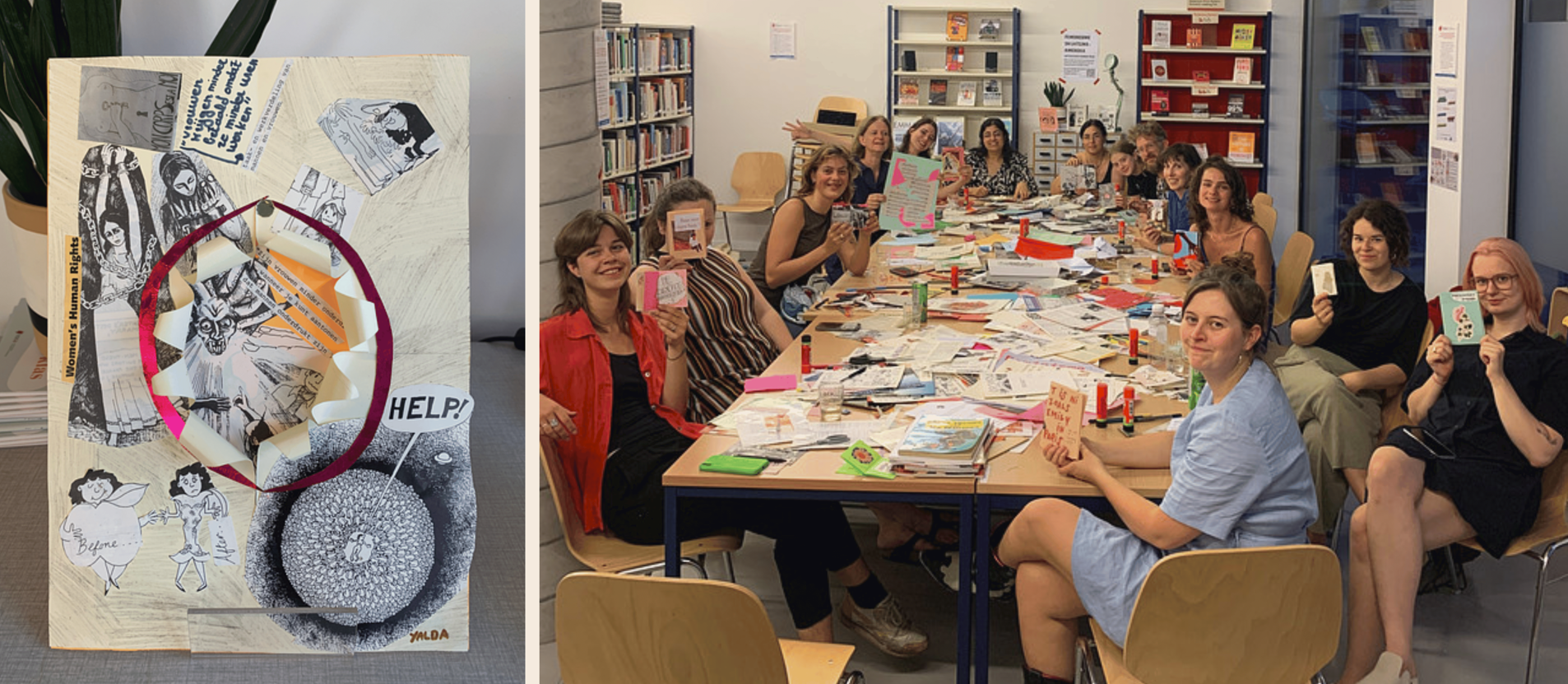 Tot slot zetten we een bezoeker in de kijker, of liever bezoekers: op 23 augustus organiseerde RoSa vzw samen met Rebelle een zineworkshop in haar bibliotheek. Tijdens onze workshop lieten bezoekers hun creativiteit los op verouderde literatuur en beeldmaterialen uit de RoSa-bib. Het resultaat? Een avond gevuld met snoepjes, levendige discussies over de Barbie-film en mooie zines met een kritische feministische inslag. Voor herhaling vatbaar dus.