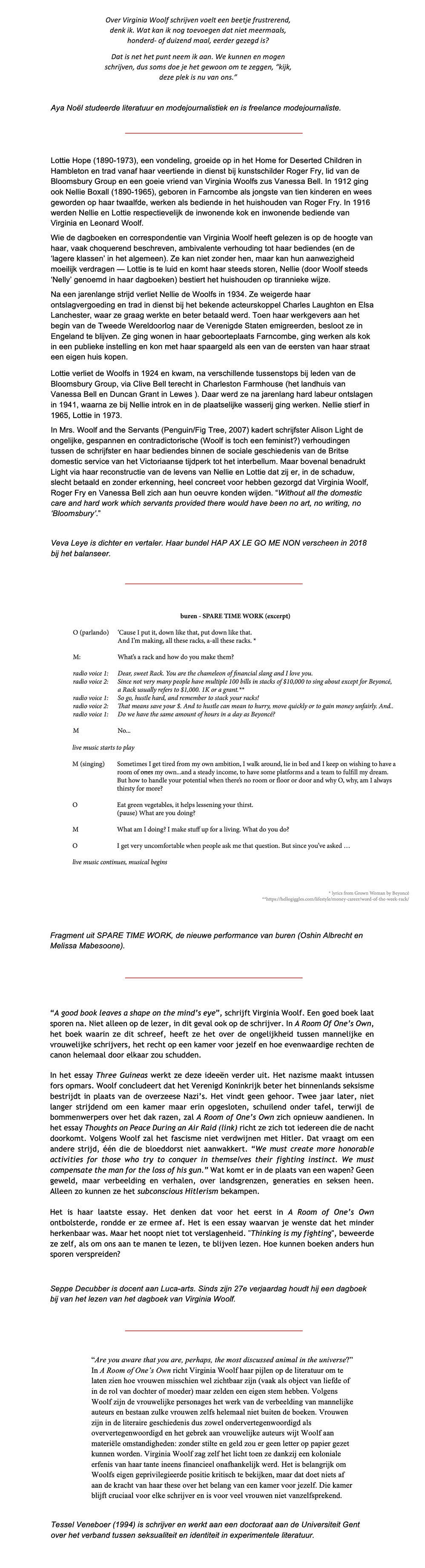Wij vroegen aan enkele Woolf-adepten of -kenners om iets te schrijven over A Room of One’s Own. Hieronder vind je bijdragen van journalist Aya Noël, dichter Veva Leye, kunstcollectief buren (Melissa Mabesoone en Oshin Albrecht), theatermaker en docent Seppe Decubber en auteur Tessel Veneboer.