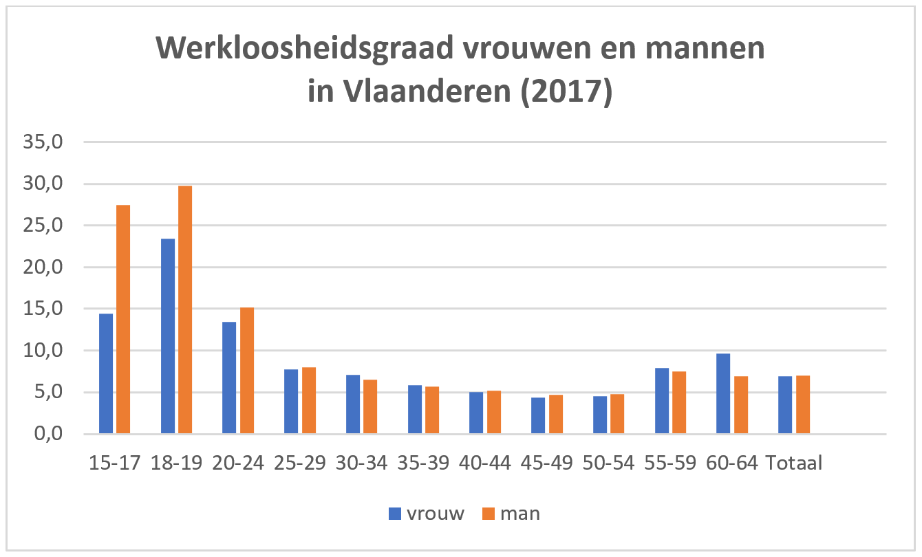Net zoals bij arbeidsparticipatie is de genderkloof groter als we naar de leeftijd kijken. Bij de jongeren onder de 20 jaar is de werkloosheid groter bij mannen. Na de leeftijd van 30 jaar ligt de werkloosheidsgraad iets hoger bij vrouwen. Vooral vrouwen boven de 55 vinden in Vlaanderen moeilijker werk dan mannen.