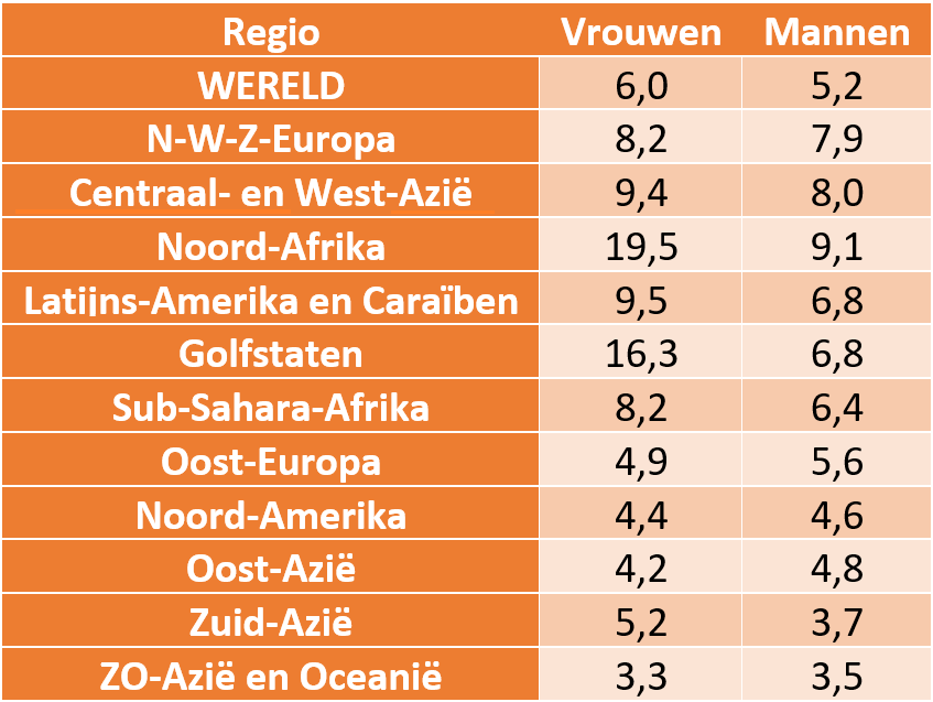 Op wereldschaal is de werkloosheid van vrouwen hoger dan die van mannen. Opnieuw gaan hier regionale verschillen achter schuil. Volgens de International Labour Organization gaat de positie van vrouwen op de arbeidsmarkt er in bepaalde regio’s zelfs op achteruit. In Noord-Afrika en de Golfstaten in het bijzonder leiden de combinatie van lagere arbeidsparticipatie en hoge werkloosheid tot een zeer precaire situatie voor vrouwen. Als oorzaken duidt de ILO onder andere op de onbetaalde zorgarbeid van vrouwen en hun beperkte onderwijskansen.[1]