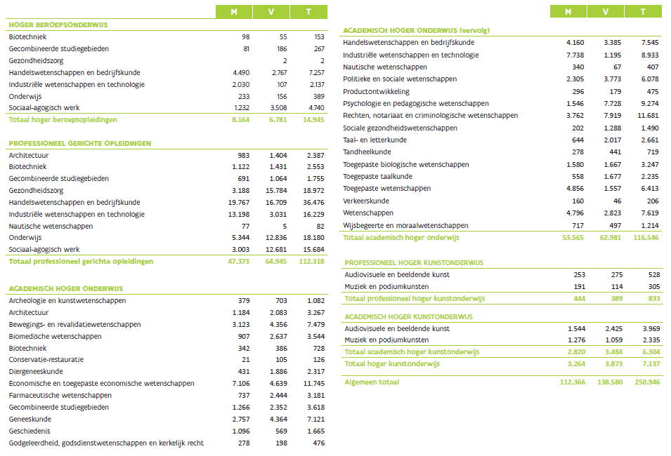 De tabellen hieronder tonen een overzicht van de genderbalans in verschillende studiegebieden. Zo valt in het hoger beroepsonderwijs op dat slechts 5% van de studenten handelswetenschap en bedrijfskunde vrouw is en mannelijke studenten op hun beurt slechts één vierde van het studenten sociaal-agogisch werk uitmaken. In de professioneel gerichte opleidingen aan hogescholen valt in het bijzonder de oververtegenwoordiging van vrouwelijke studenten op in de opleidingen gezondheidszorg (83%), sociaal-agogisch werk (81%), onderwijs (70%) en in mindere mate ook in architectuur (59%). Mannelijke studenten zijn dan weer disproportioneel aanwezig in de opleidingen nautische wetenschappen (94%), industriële wetenschappen en technologie (81%) en in mindere mate ook in handelswetenschappen en bedrijfskunde (54%). In de academisch gerichte opleidingen aan de universiteiten zijn er meer vrouwelijke studenten in de opleidingen sociale gezondheidswetenschappen, psychologie en pedagogische wetenschappen (83%), dierengeneeskunde (81%), farmaceutische wetenschappen (77%), taal- en letterkunde (76%), biomedische wetenschappen (74%), en in mindere mate ook geneeskunde (61%). Mannelijke studenten zijn op hun beurt oververtegenwoordigd in de opleidingen industriële wetenschappen en technologie (86%), nautische wetenschappen (83%), toegepaste wetenschappen (76%) en in mindere mate ook geschiedenis (66%) en wetenschappen (63%).