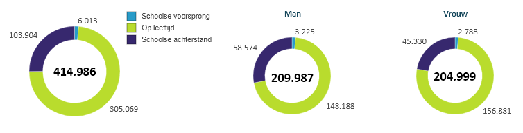 In het voltijds secundair onderwijs is niet alleen het totaal leerlingen met een schoolse achterstand verdubbeld van 12% naar 25% maar is er ook sprake van een groter genderverschil: maar liefst 28% van alle jongens tegenover 22% van alle meisjes heeft minstens één leerjaar gedubbeld. Schoolachterstand van meer dan één jaar komt ook vaker voor bij jongens dan bij meisjes.